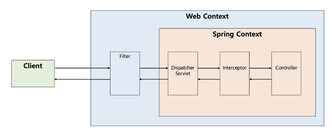 디스패처 서블릿이 컨트롤러를 호출하기 전과 후의 요청과 응답을 참조하거나 가공할 수 있는 기능을 제공하며, 스프링 컨택스트에서 동작합니다.