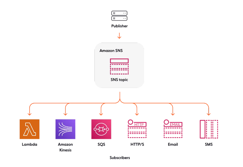 AWS SQS 대기열, AWS Lambda 함수 및 HTTP endpoint와 같은 다양한 유형의 구독자(Subscriber)에게 메시지를 전송할 수 있습니다(A2A). 또한 SNS를 사용하여 end-user 장치에 SMS 메시지, 전자 메일 및 푸시 알림을 보낼 수 있습니다(A2P).