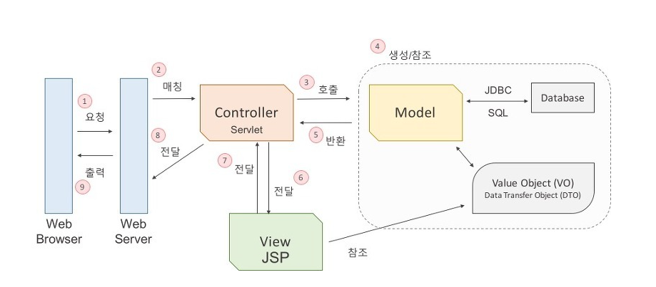 1. 웹 브라우저가 웹 서버에 웹 애플리케이션 실행을 요청한다. (MVC 구조가 WAS라고 보면 된다.)