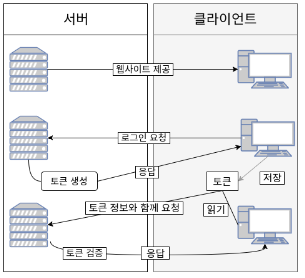 토큰(Token)은 클라이언트가 서버에 접속을 하면 서버에서 해당 클라이언트에게 인증되었다는 의미로 '토큰'을 부여합니다. 이 토큰은 유일하며 토큰을 발급받은 클라이언트는 또 다시 서버에 요청을 보낼 때 요청 해더에 토큰을 심어 보냅니다. 그러면 서버에서는 클라이언트로부터 받은 토큰을 서버에서 제공한 토큰과의 일치 여부를 체크하여 인증 과정을 처리하게 됩니다.