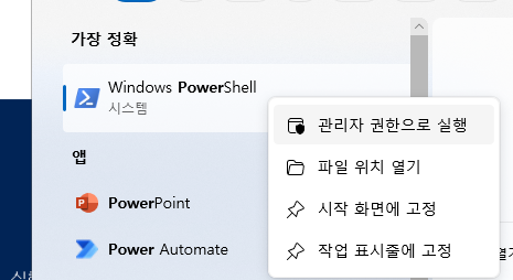 이것은 Execution Policy와 관련한 문제로 Windows PowerShell을 관리자 권한으로 실행해줍니다.