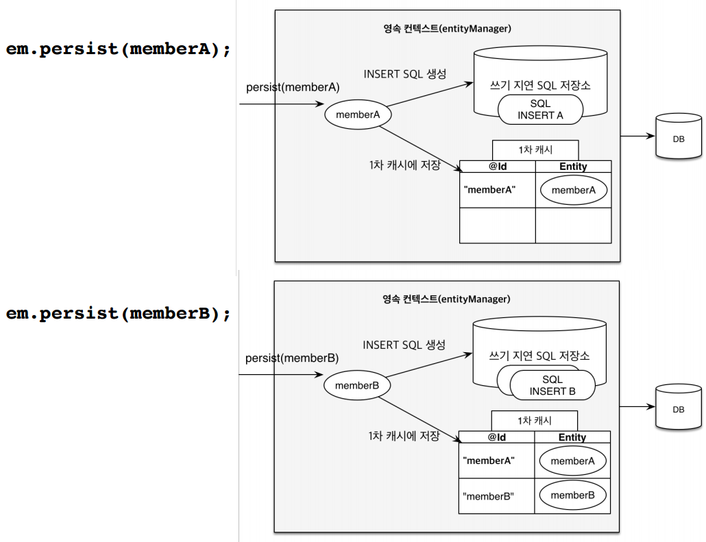 | 쓰기 지연(SQL 저장소) | INSERT SQL은 즉시 실행되지 않고 모아졌다가 flush() 또는 commit() 시점에 실행됨 |