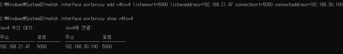 netsh interface portproxy add v4tov4 listenport=5000 listenaddress=192.168.21.47 connectport=5000 connectaddress=192.168.30.100
