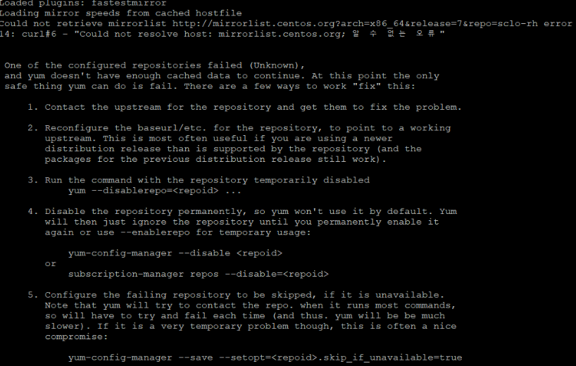 여기 게시글을 찾은 사람들은 yum 을 사용할 때 위 오류를 보고 들어왔을 것으로 추측됩니다... CentOS 7 은 2024 년 6월을 끝으로 공식 지원이 종료되었기 때문에 기존의 mirrorlist 를 통해 패키지를 내려받는 방식이 더이상 동작하지 않게 되어버렸습니다. 그렇기 때문에 이 때는 CentOS 저장소를 재설정하여 패키지를 설치할 수 있습니다! 1. 기존 Repo 백업 먼저 기존 저장소 설정 파일들을 백업해 둡니다.# yum.repos.d 디렉토리로 이동cd /etc/yum.repos.d# 기존 repo 파일들을 저장할 backup 디렉토리 생성mkdir backup# 기존 repo 파일들 백업mv *.repo backup/ 2. 새 Repo 파일 적용직접 CentOS 저장소를 재설정합니..